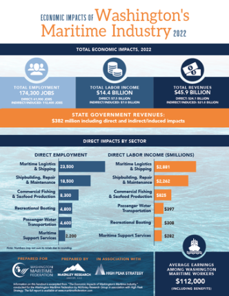 The Washington Maritime Federation released the Washington State Maritime Sector Economic Impact Study 2022. The study details an industry that is a foundation of our state’s economy and a leader in innovation and sustainability.